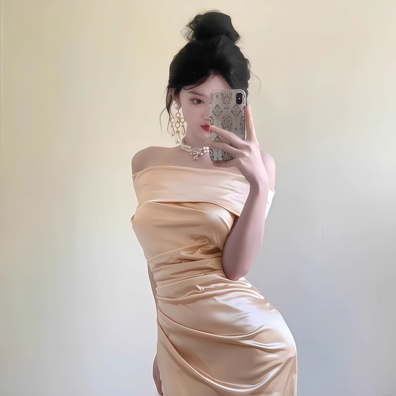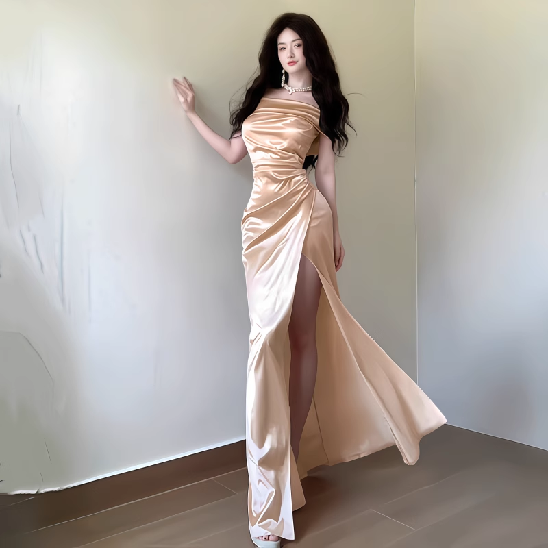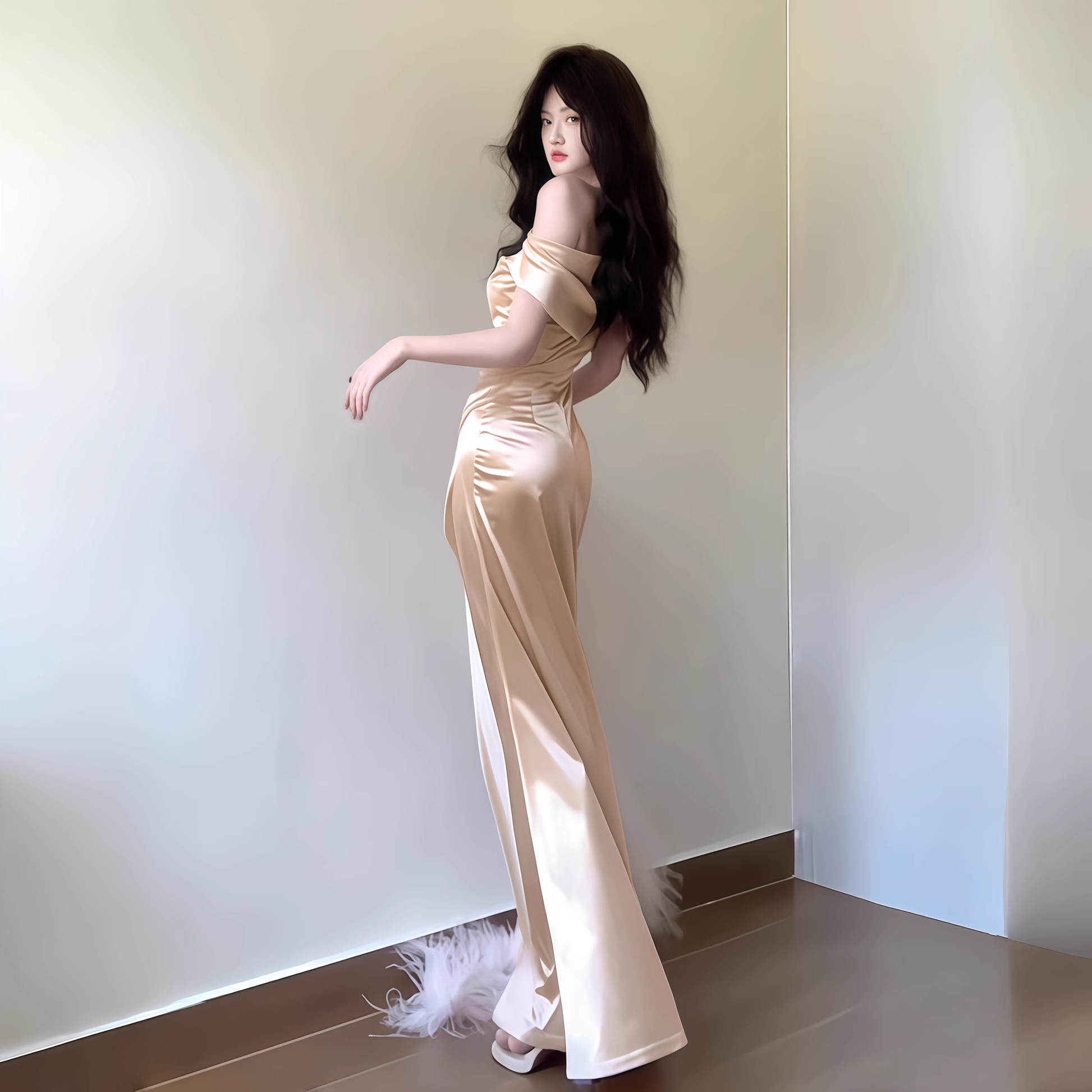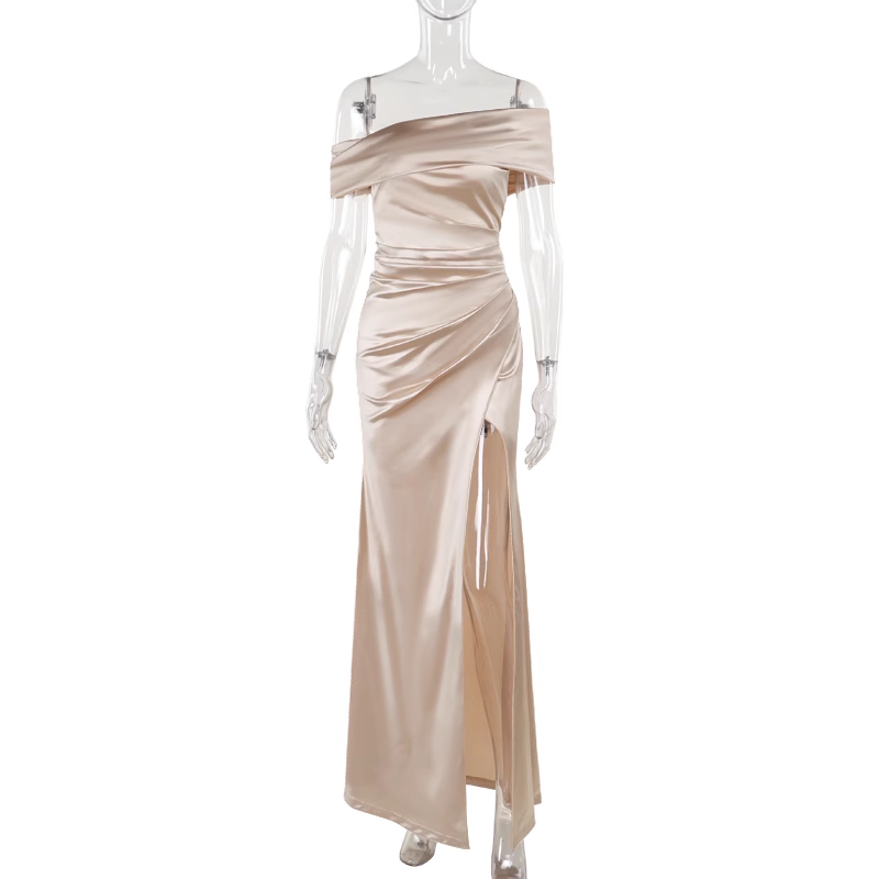 Classy Champagne Off The Shoulder Birthday Party Dress Satin Slit Long Holiday Dress YM2233