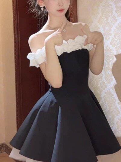 Classy Off The Shoulder ALine Short Dress Black Holiday Dress YM2164