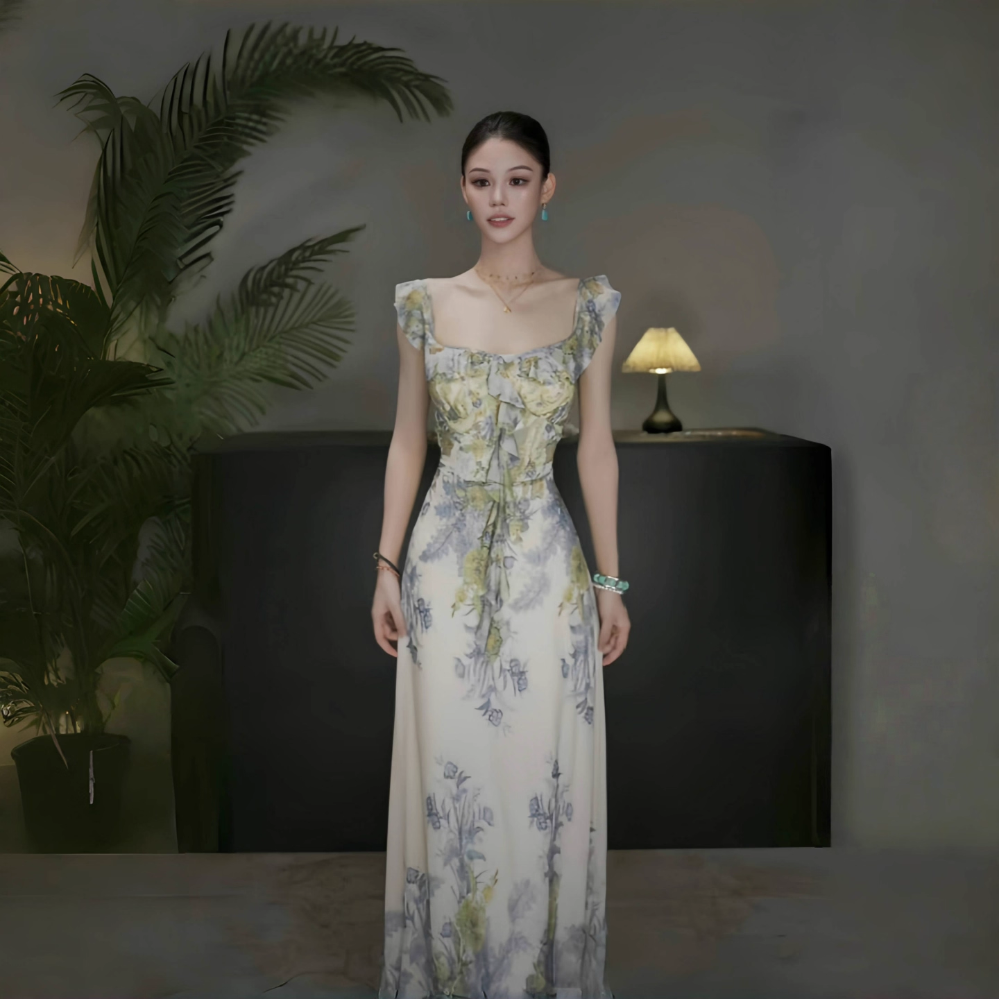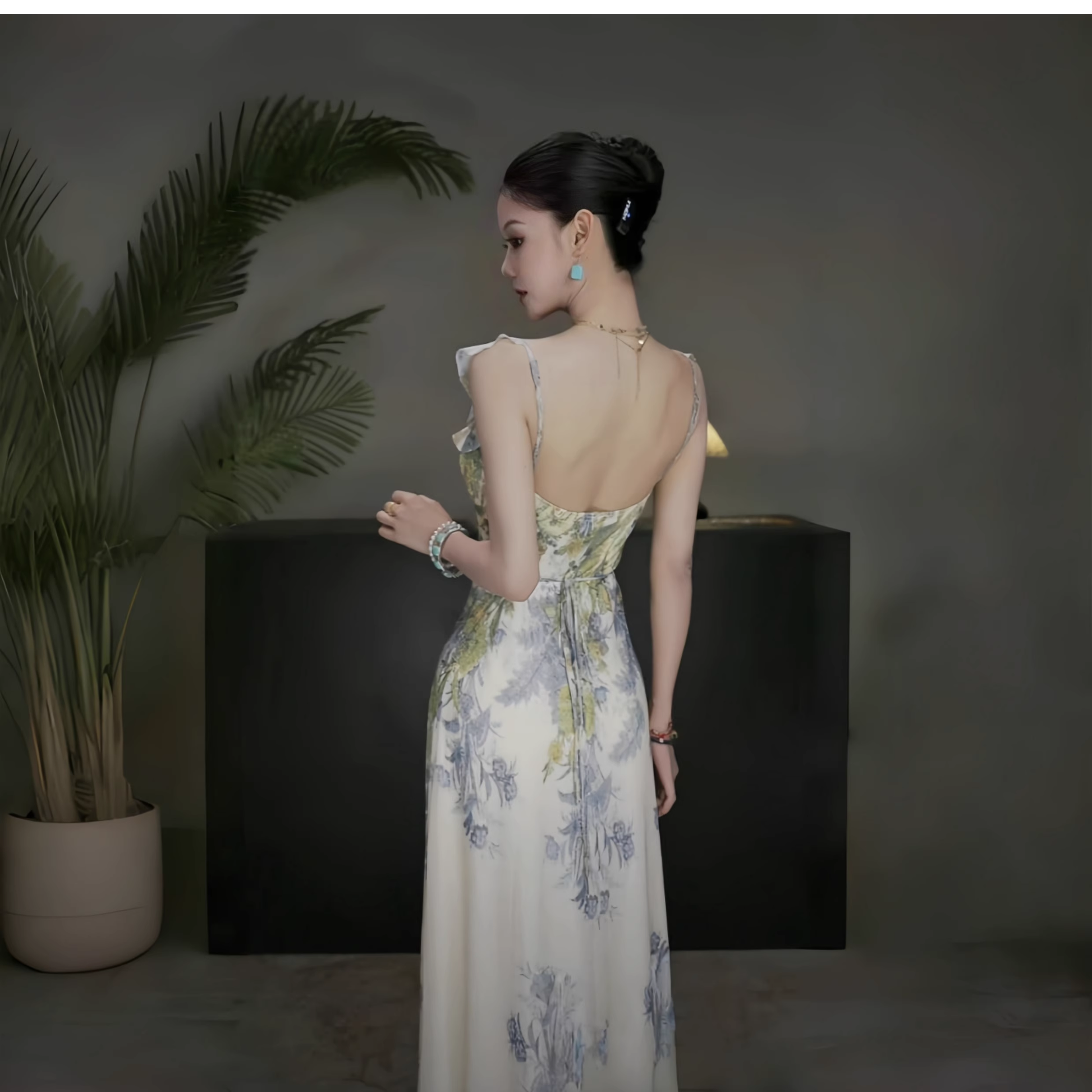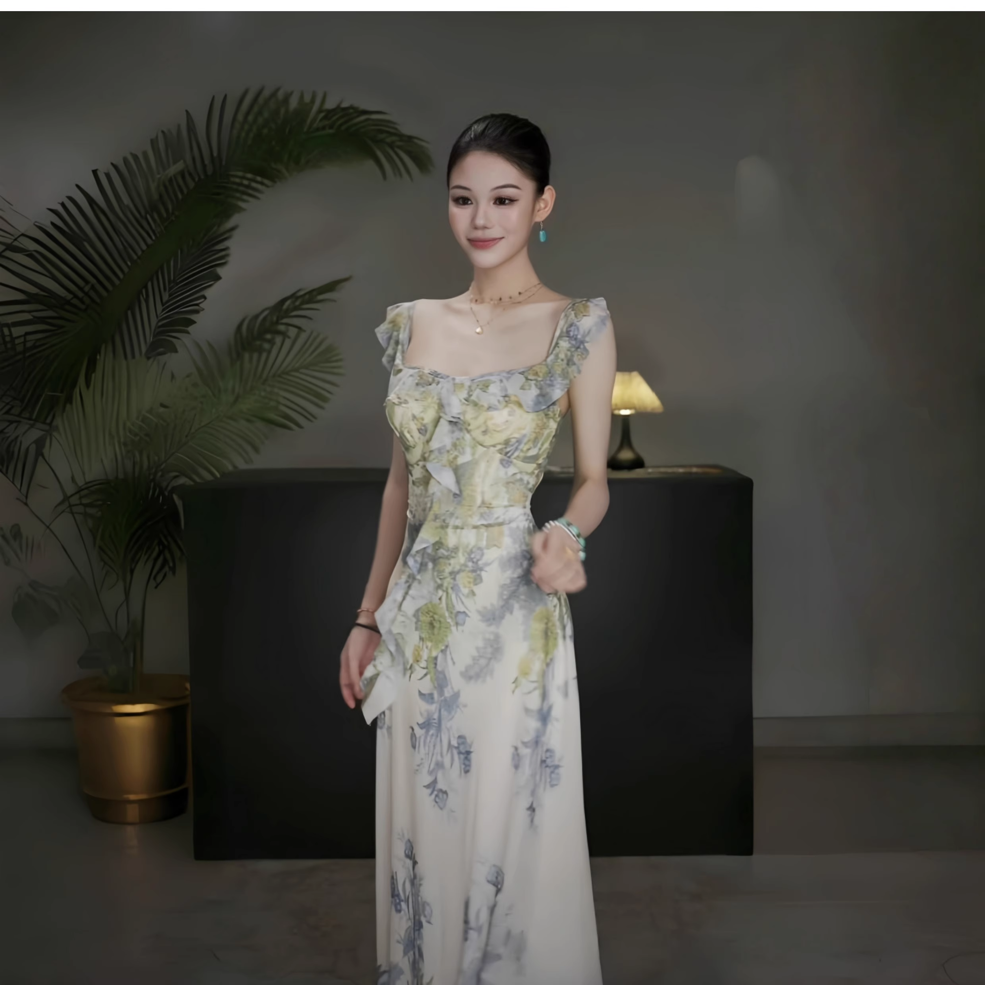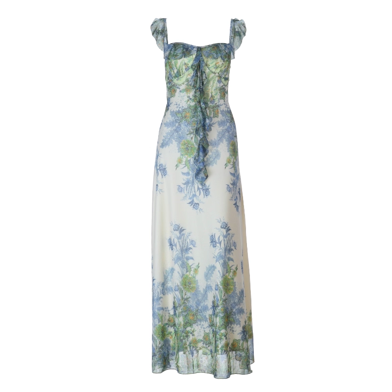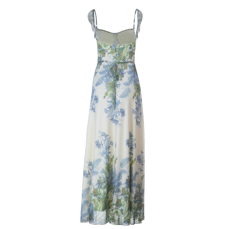 Fashion Green Printed Floral Straps Birthday Dress Women's Sexy Long Holiday Dress YM2280