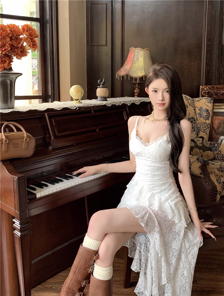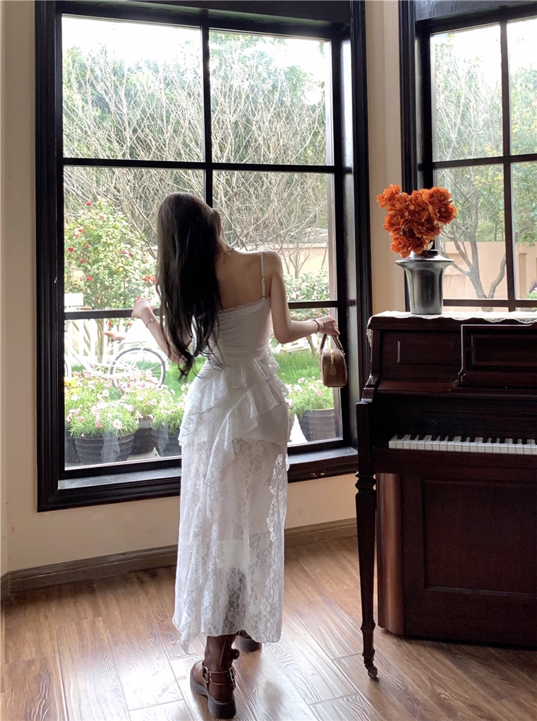 French Lace V-neck Suspender Dress Summer Vacation Dress Irregular White Long Holiday Dress YM2111