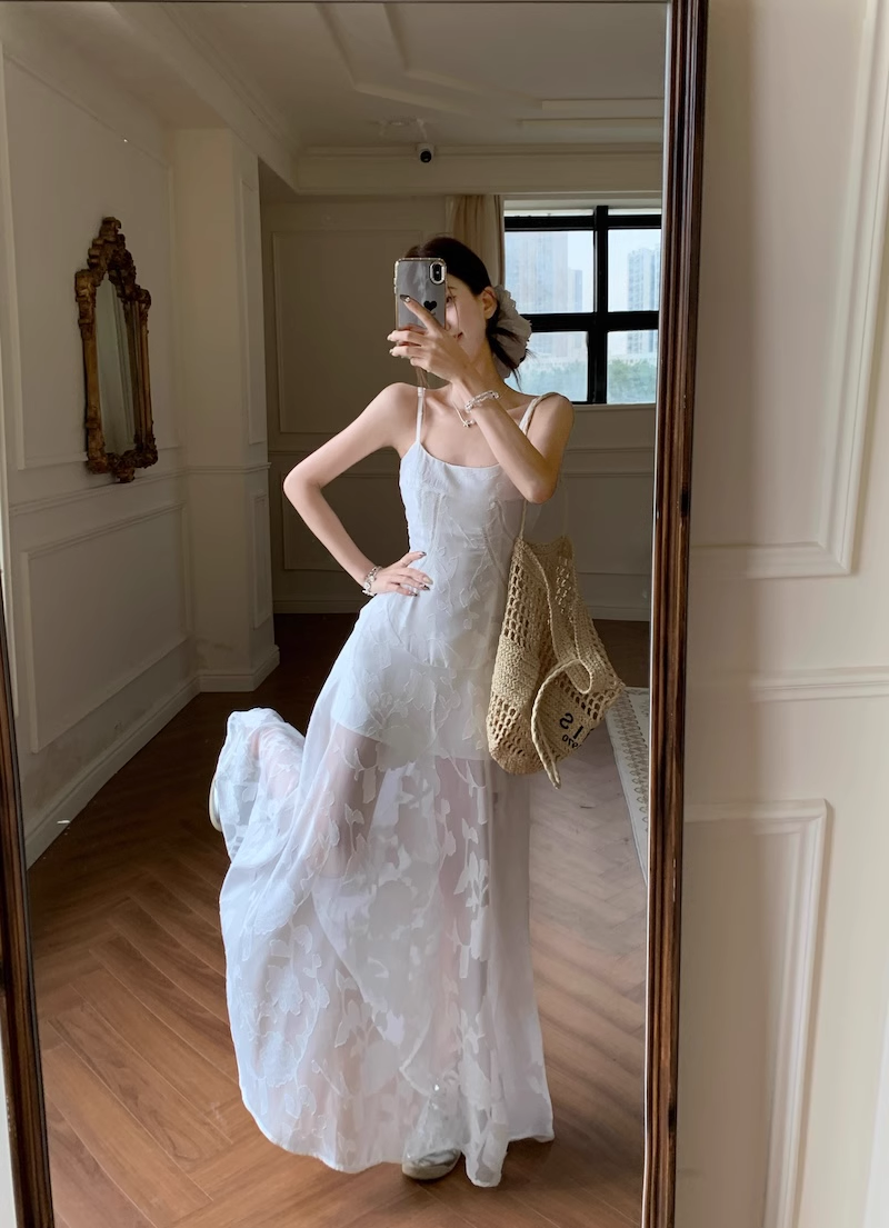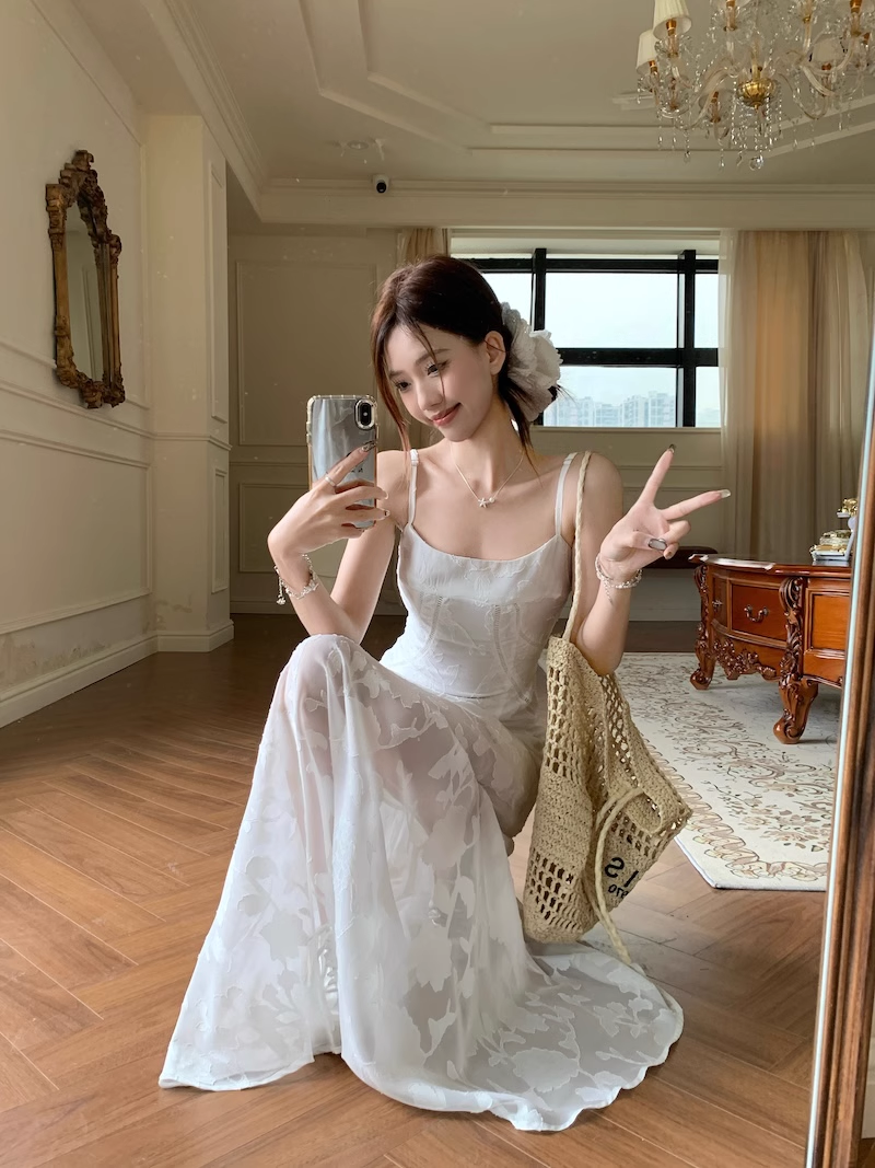 Jacquard Suspender Dress Summer White Seaside Holiday Dress YM2113