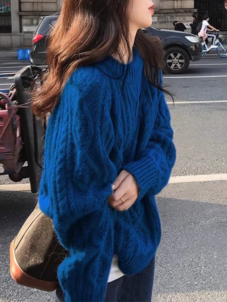Klein Blue Retro Cable Knit Sweater Thickened Loose Knitwear YM2416