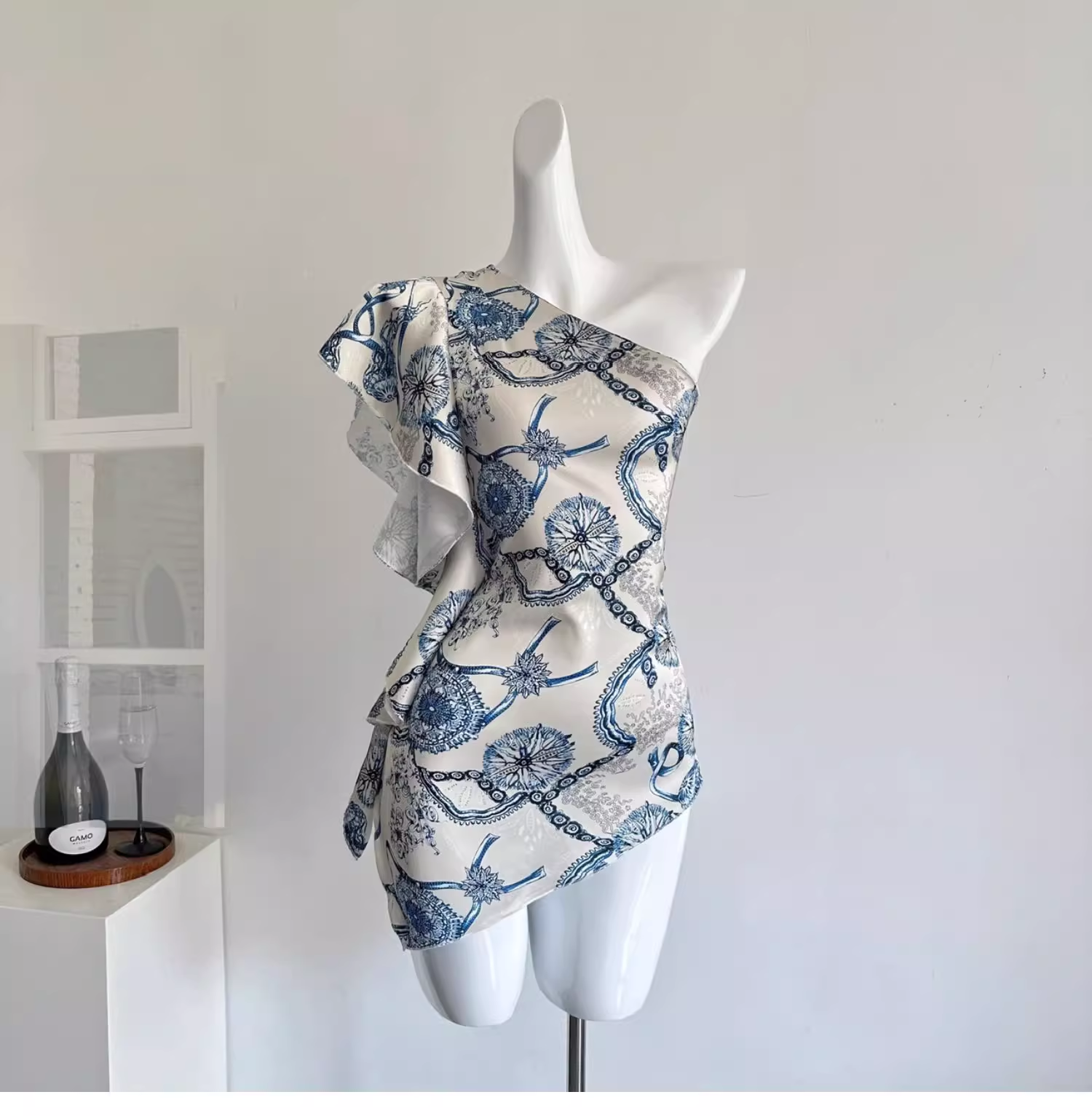 Off-shoulder Irregular Satin Print Hot Girl Sexy Mini Dress Holiday Dress YM2091