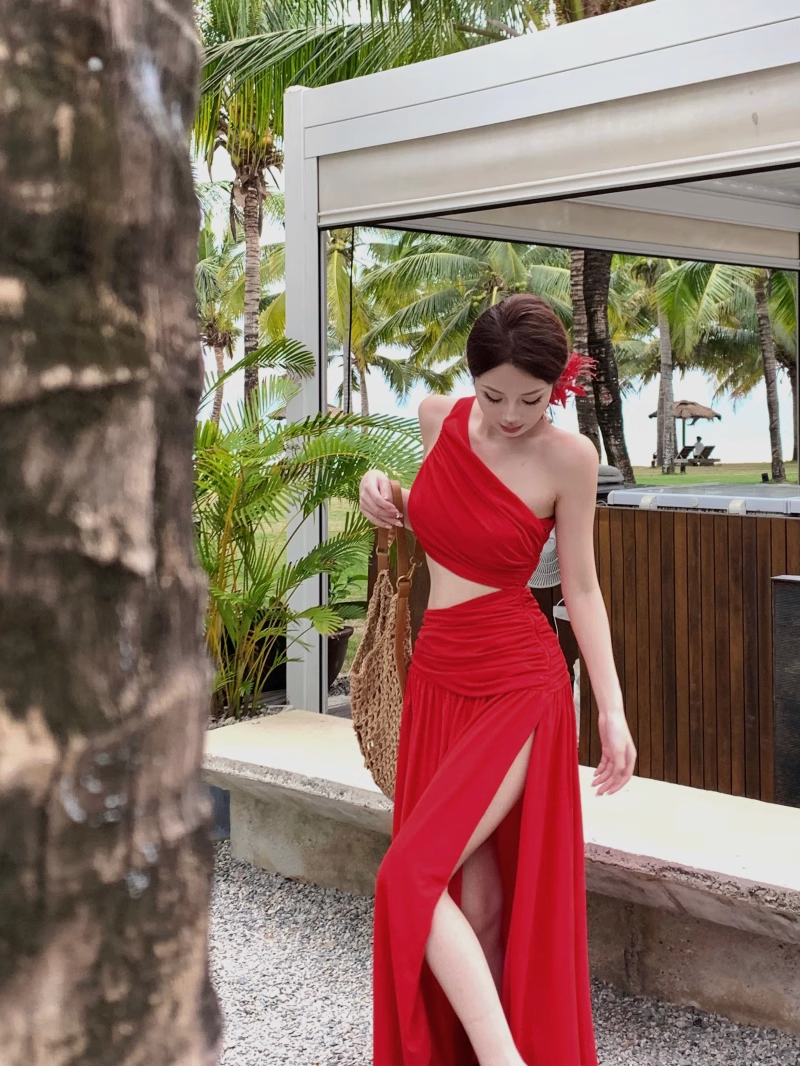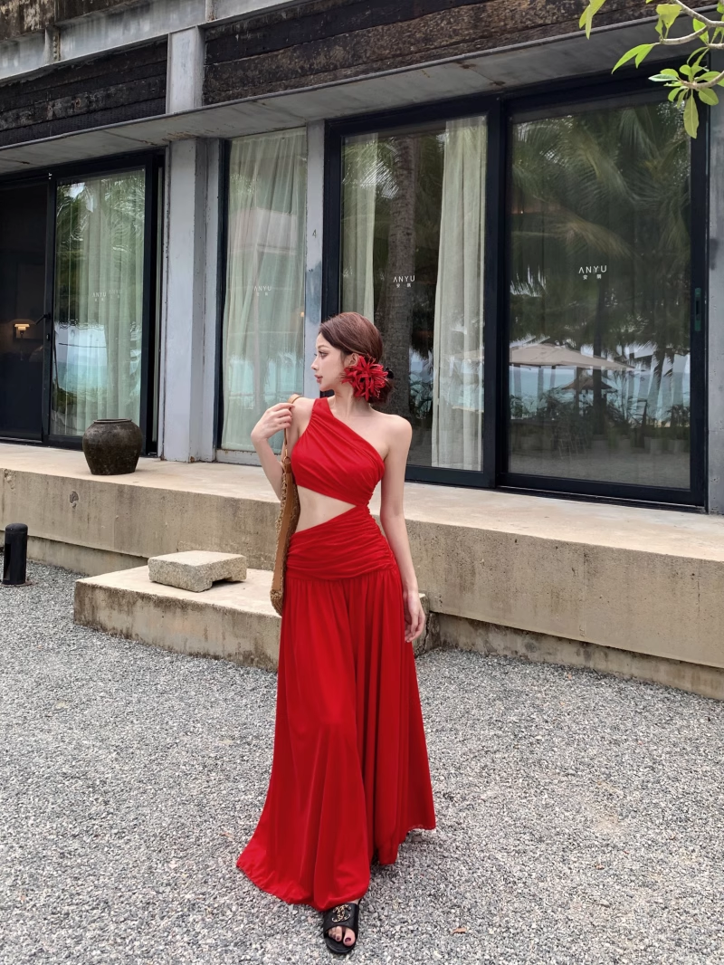 Off-shoulder Sleeveless Red With Hollow Slit A-line Long Holiday Dress Vacation Dress YM2110