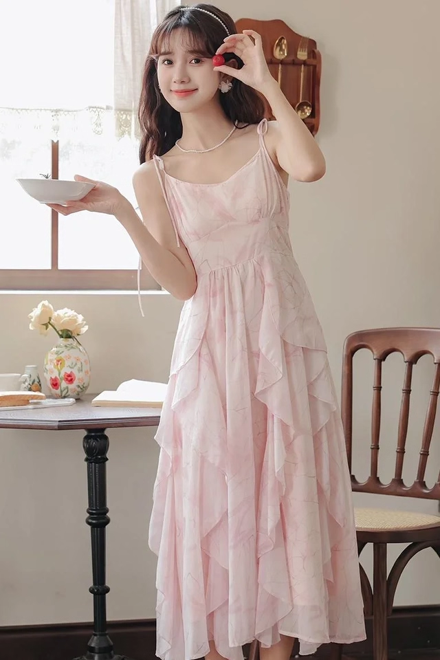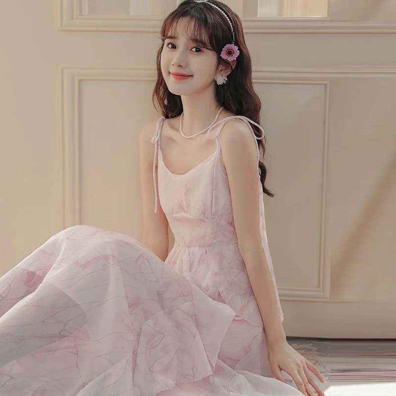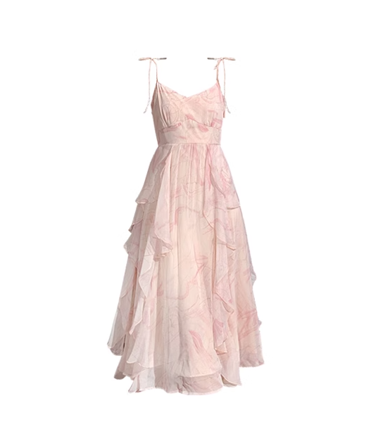 Pink Suspender Holiday Dress Ruffle Fairy Seaside Vacation Dress YM2327