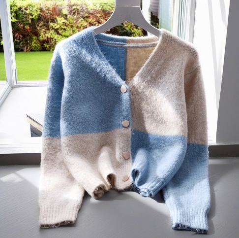 Pink V-neck Contrasting Sweater Jacket Short Women's Knitted Cardigan YM2377