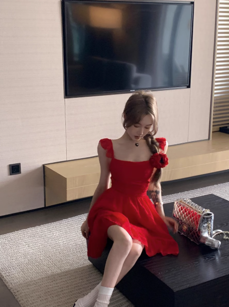 Red Sexy Backless Square Neck Straps Short Birthday Party Dress A Line Vacation Dress YM2131