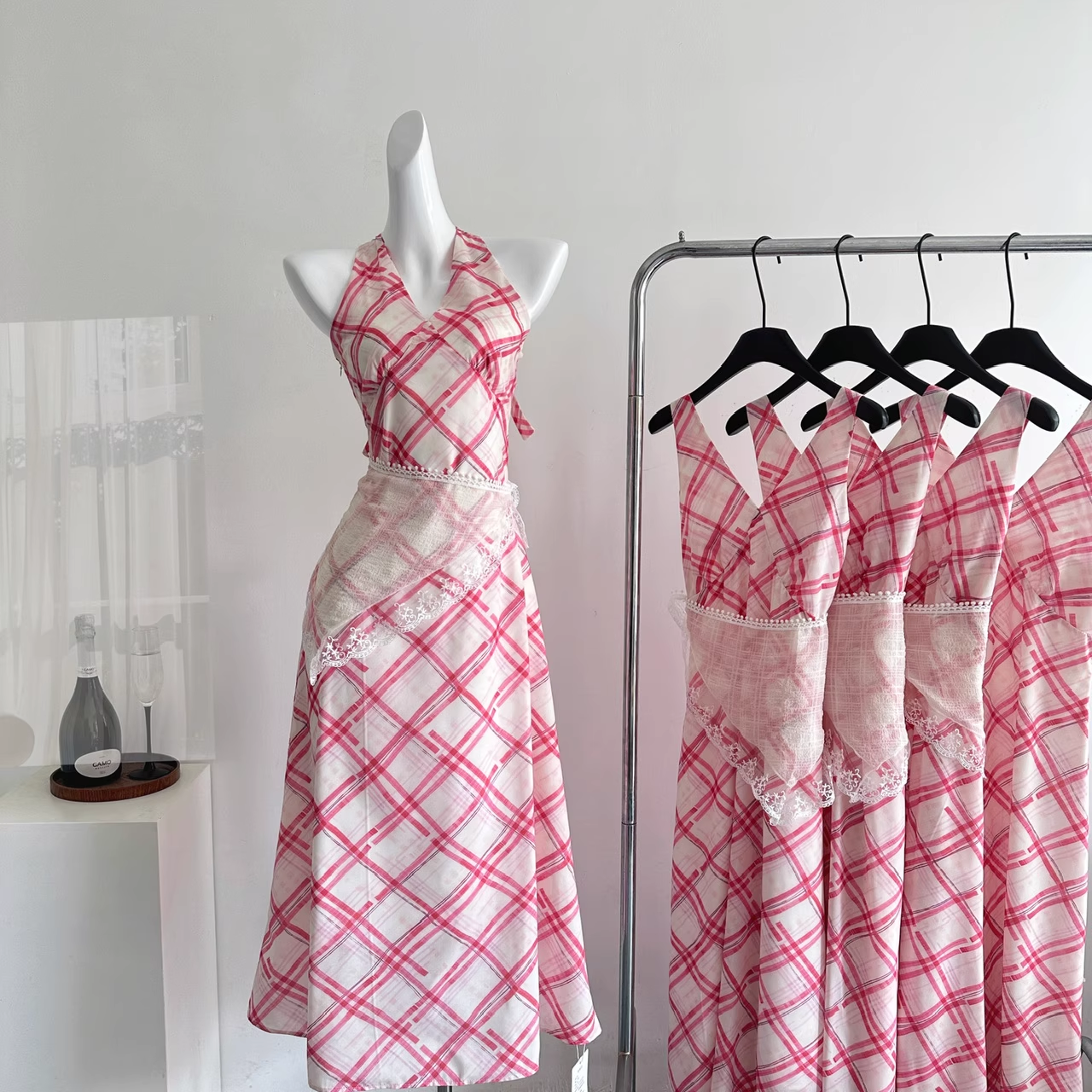Red White Grid French A Line Vacation Dress Birthday Dress YM2081
