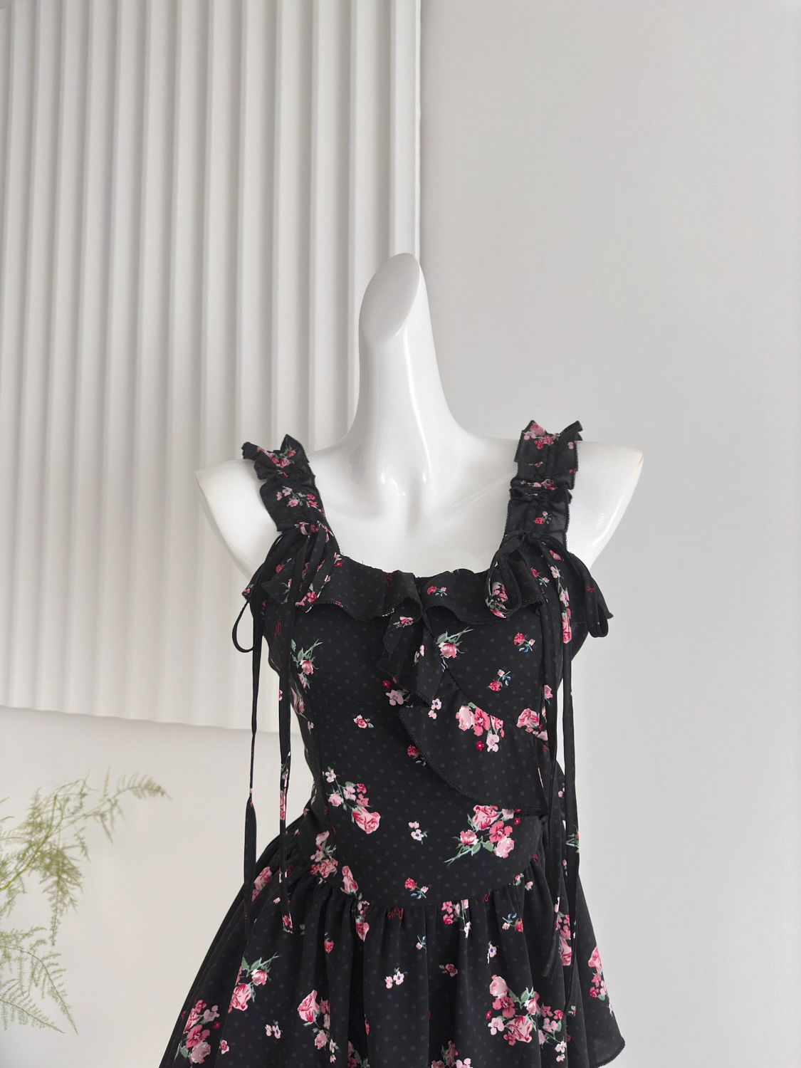 Retro Black Floral Short Dress Vacation Dress YM2315