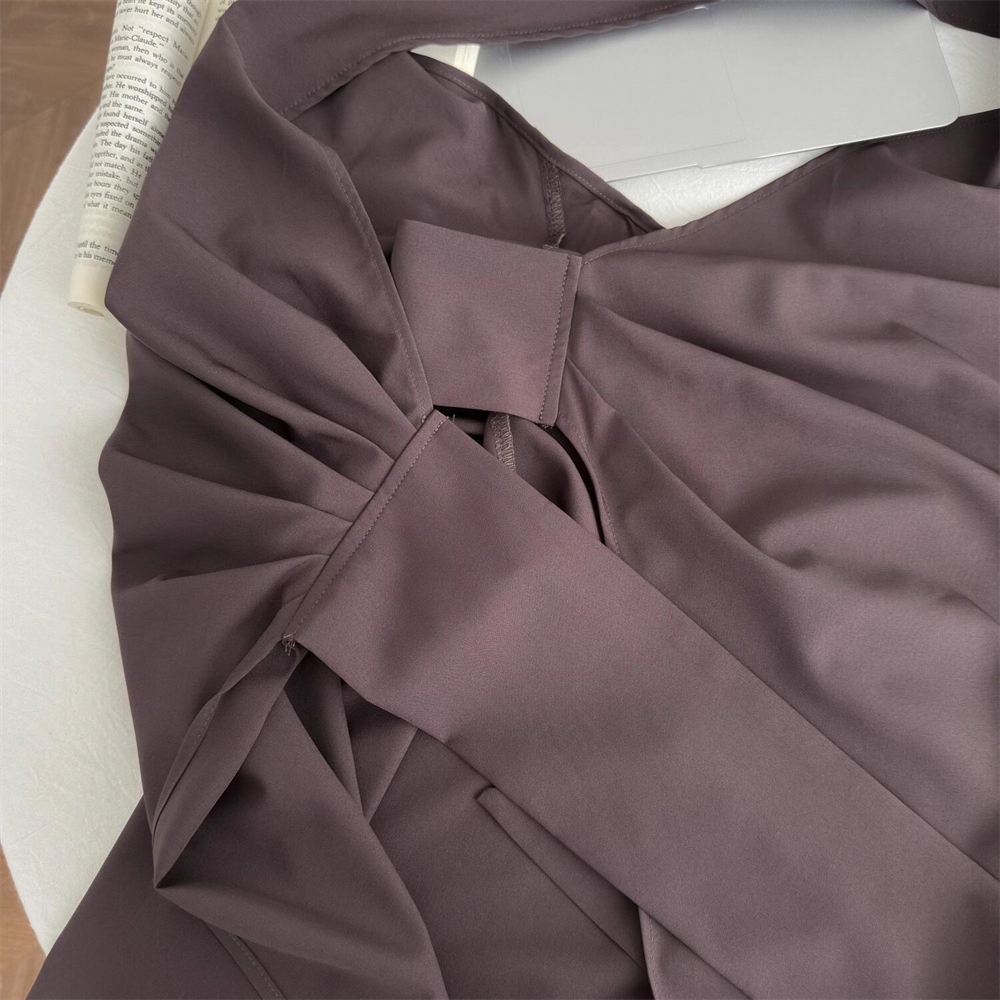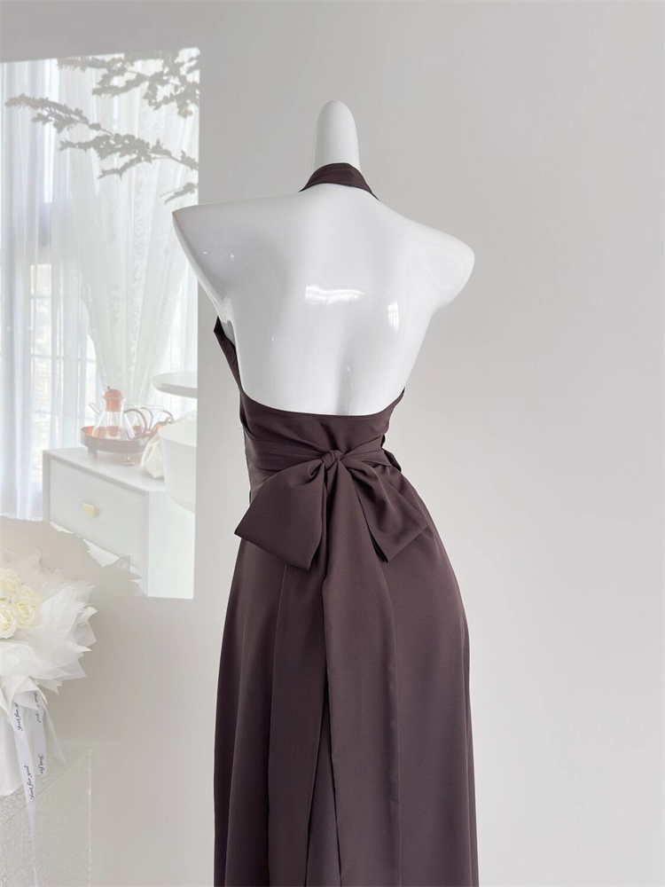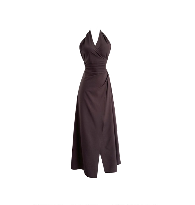 Retro Coffee Color V-neck Halter Dress New Style Waist Slimming Slit Backless Long Holiday Dress YM2321