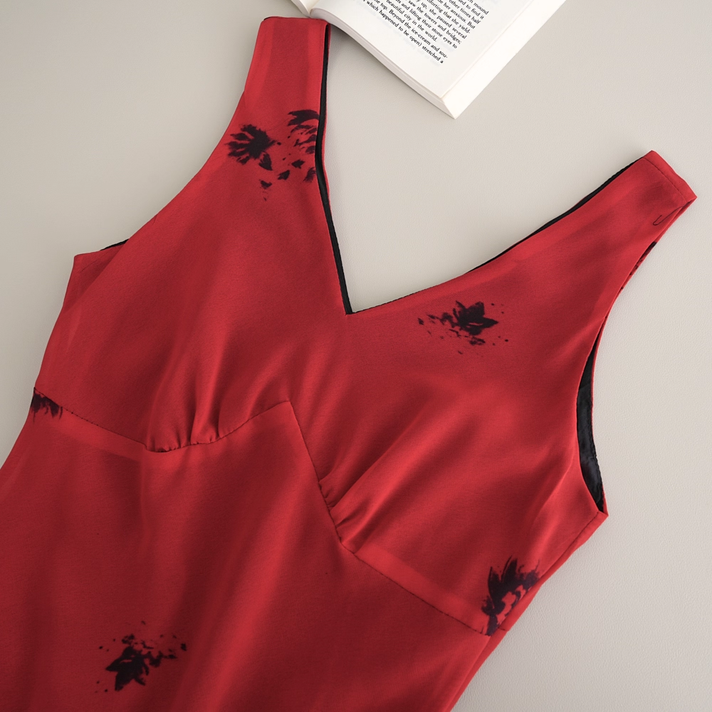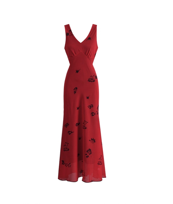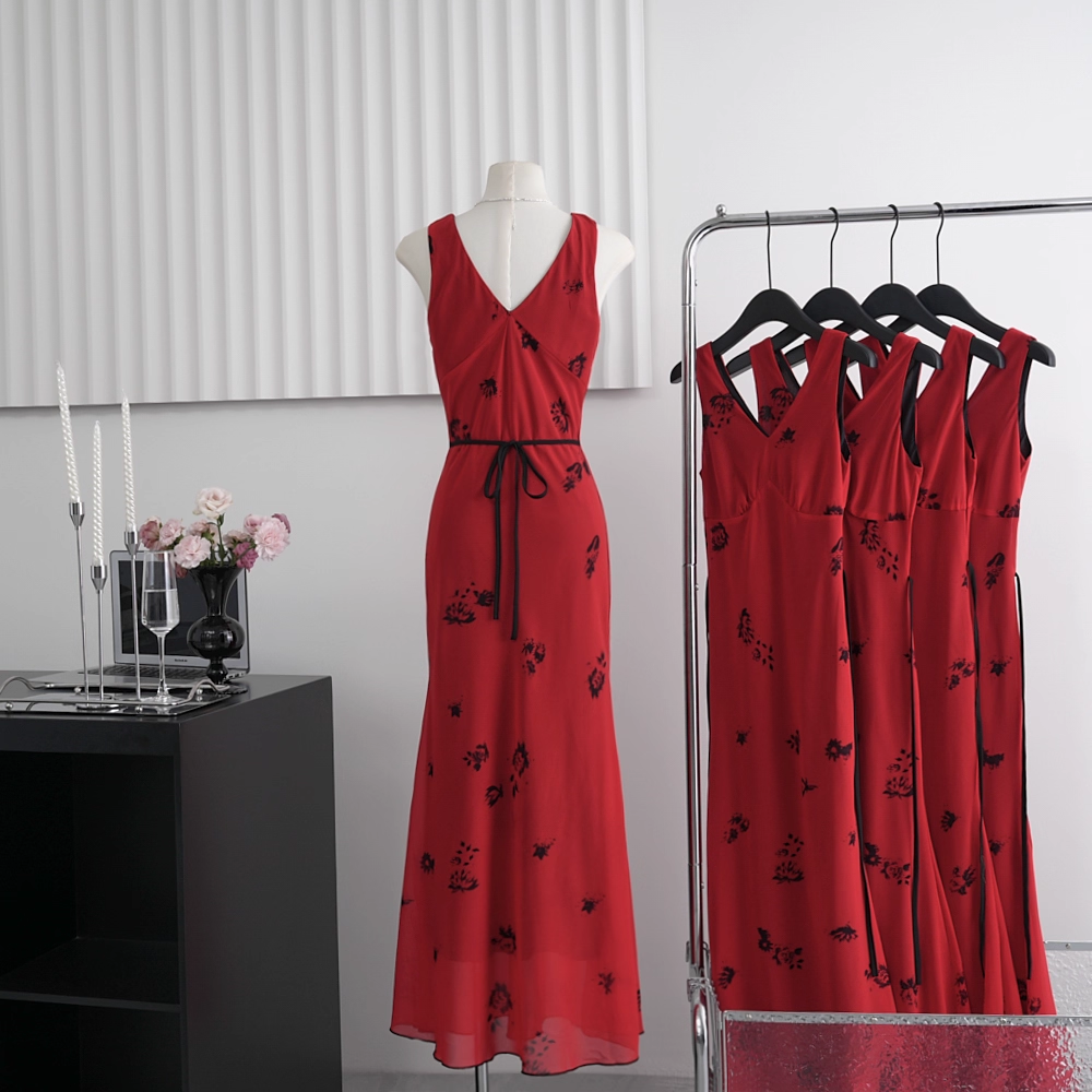 Retro Red V-neck Suspender Holiday Dress Long Birthday Dress YM2317