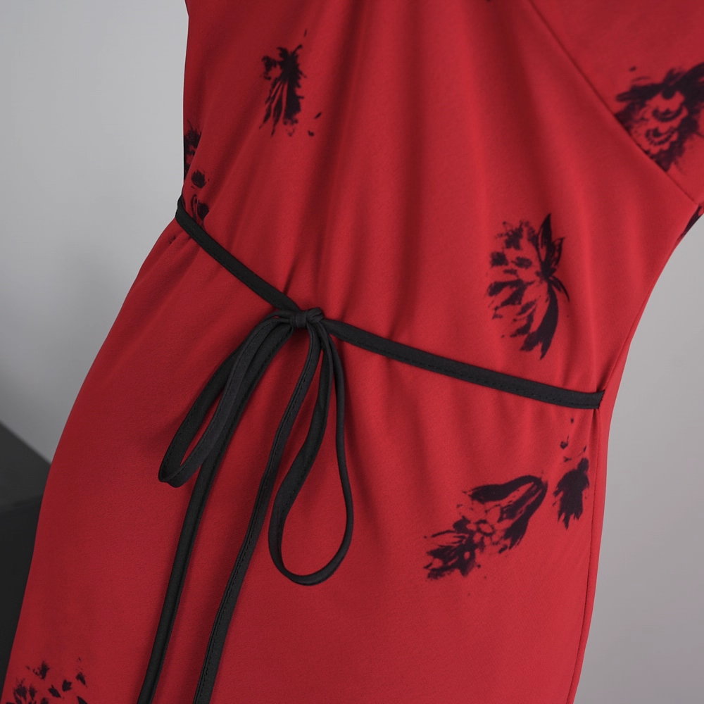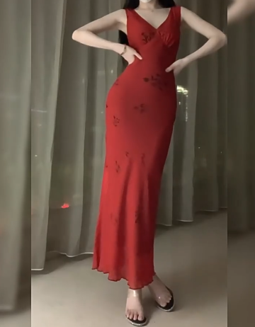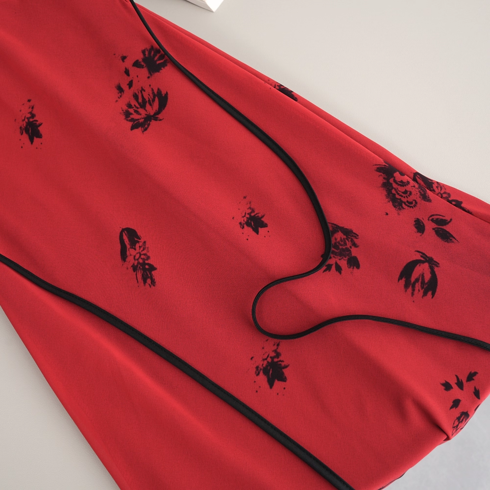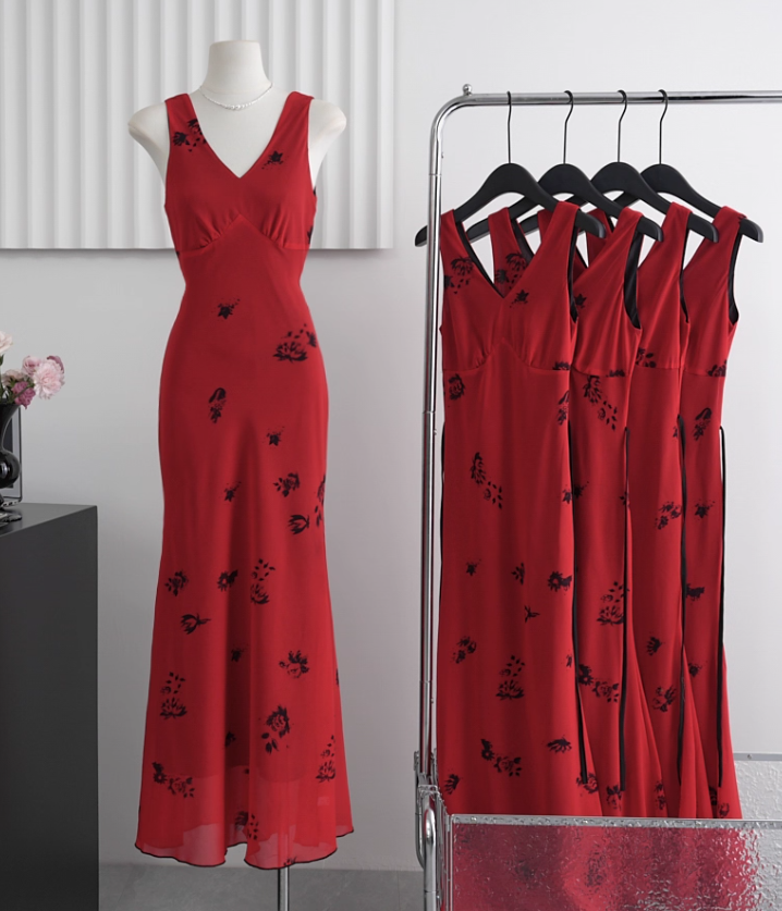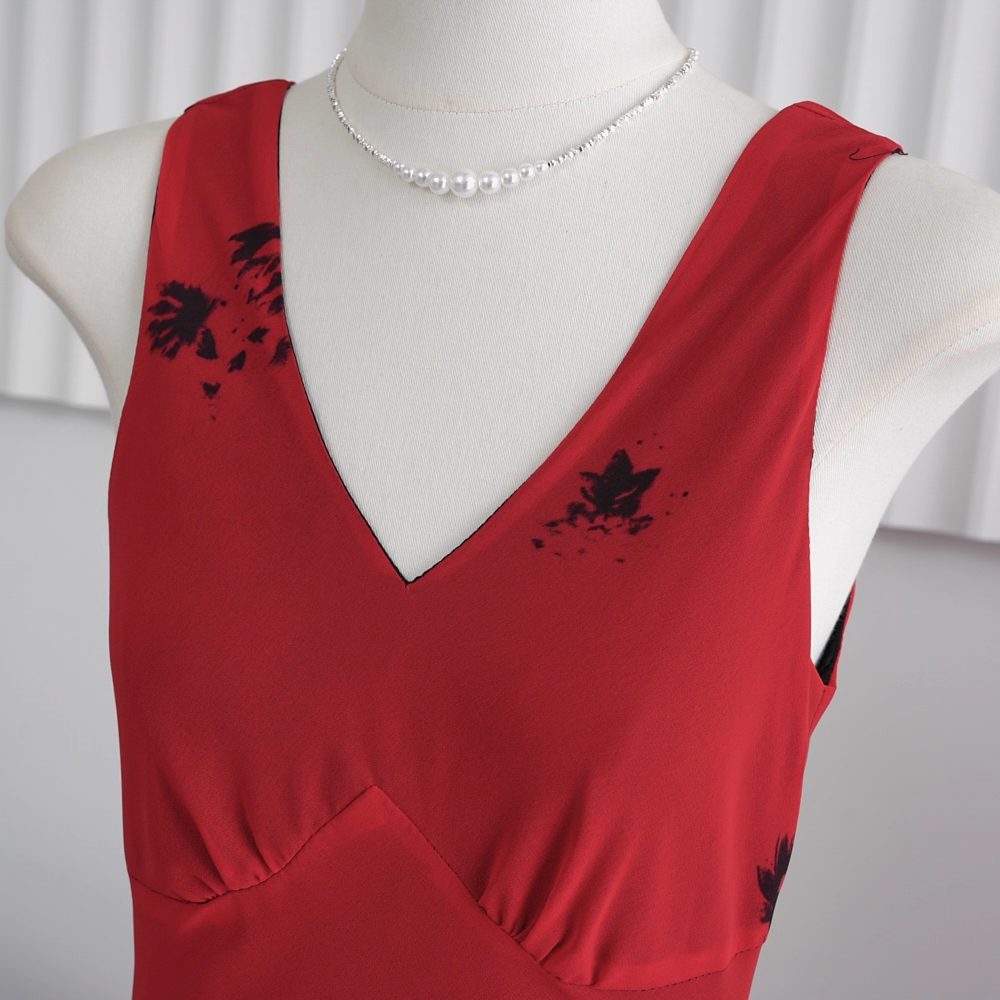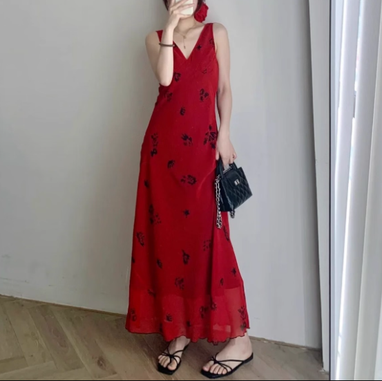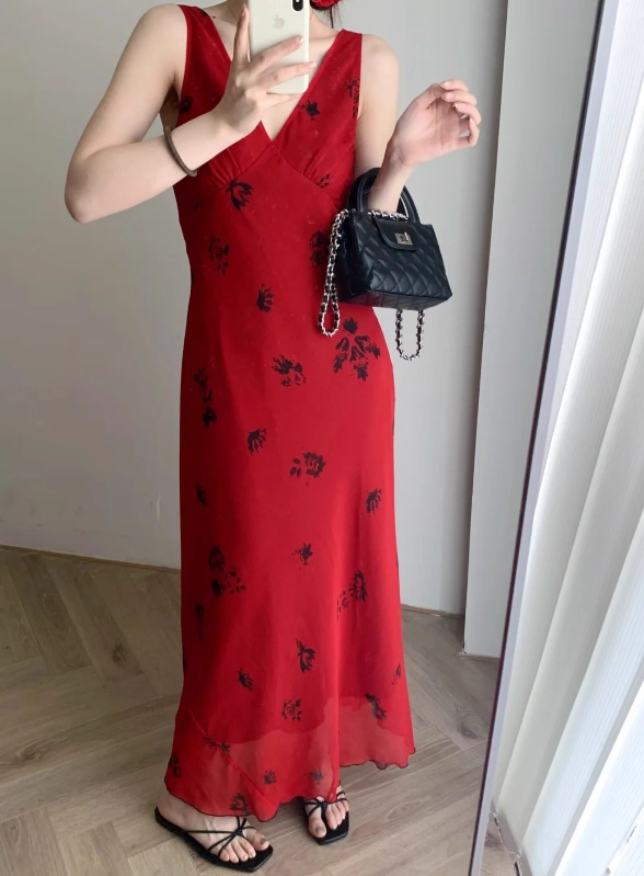 Retro Red V-neck Suspender Women Dress Long Holiday Dress YM2328