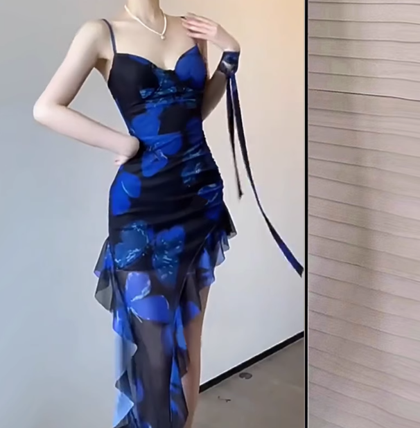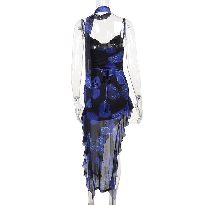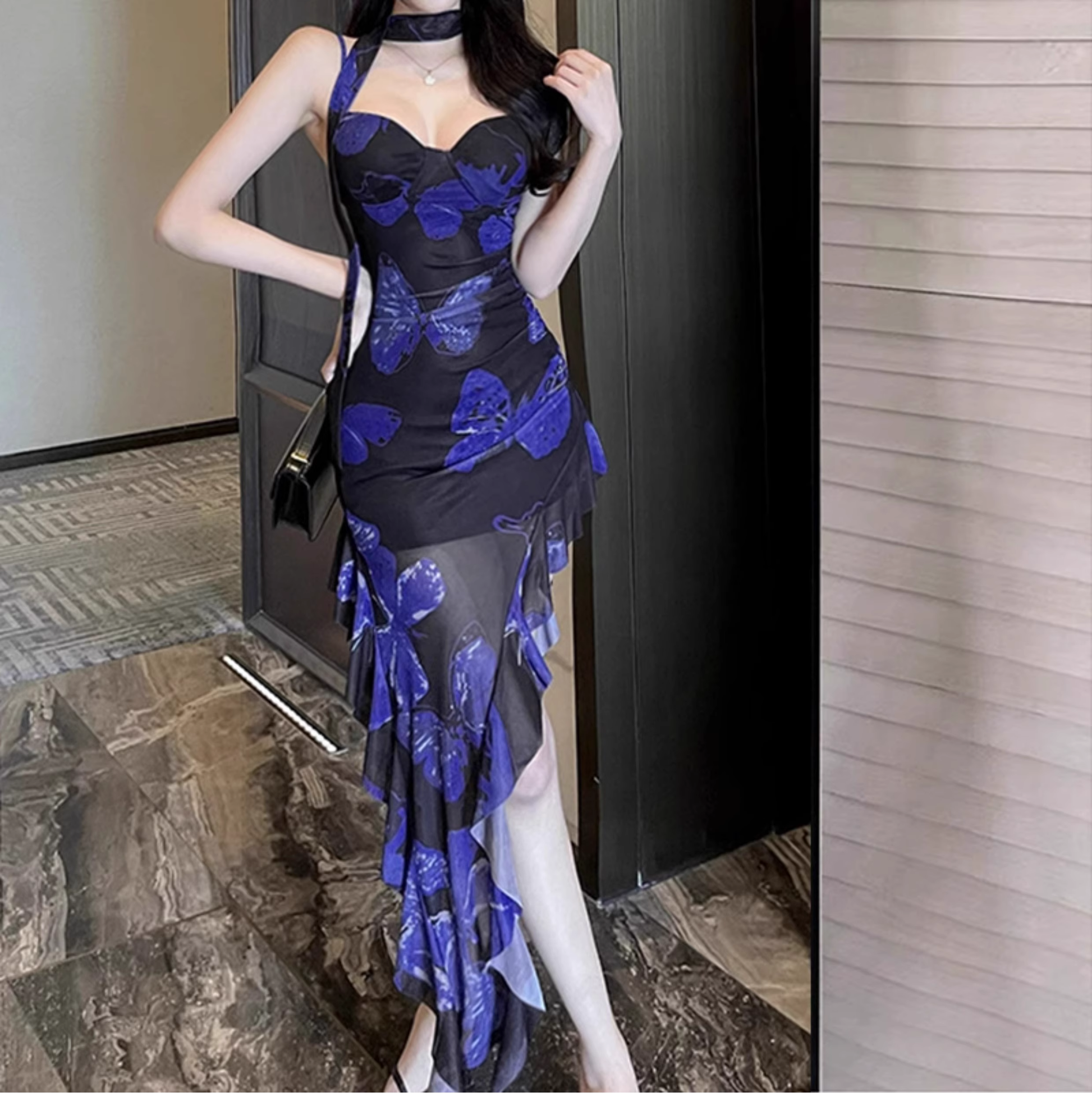 Romantic Blue Print Holiday Straps Irregular Mermaid Backless Vacation Dress Party Dress YM2135