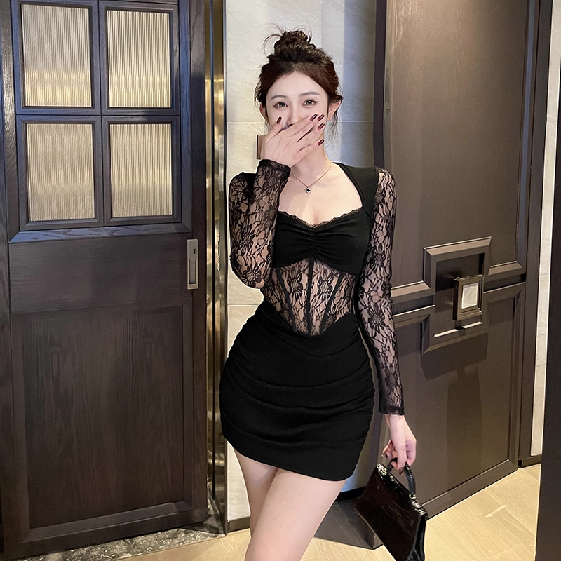 Sexy Black Lace Long-Sleeved Sheath Short Holiday Dress YM2259