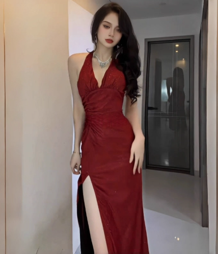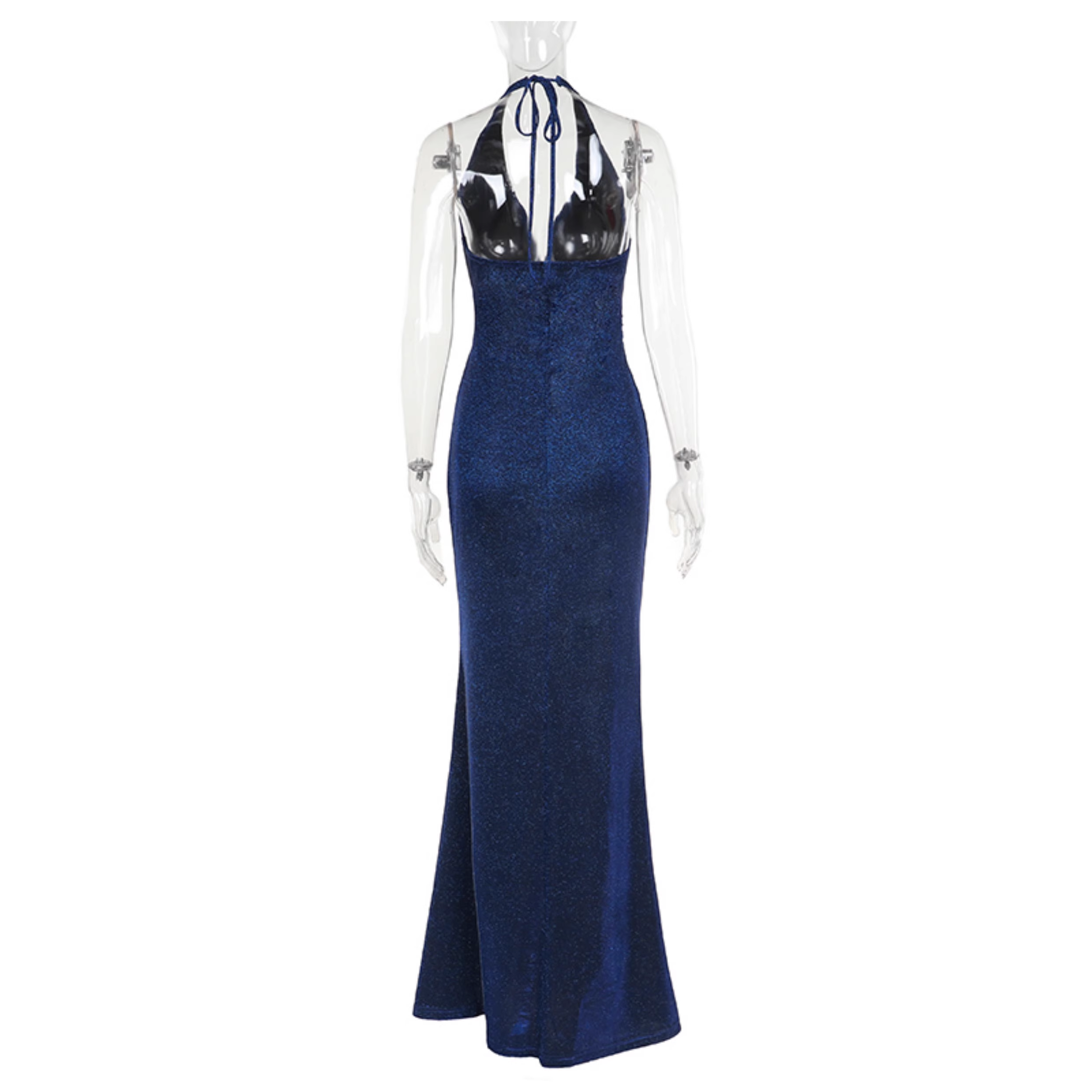 Sexy Halter V Neck Blue High Slit Birthday Party Dress Long Vacation Dress YM2214