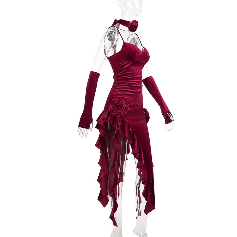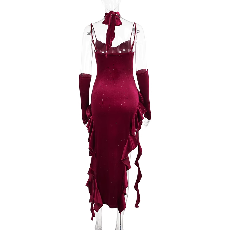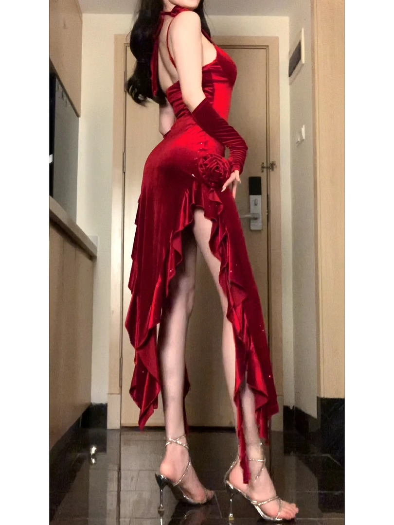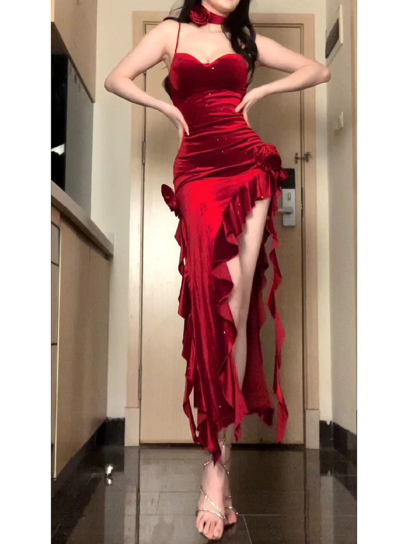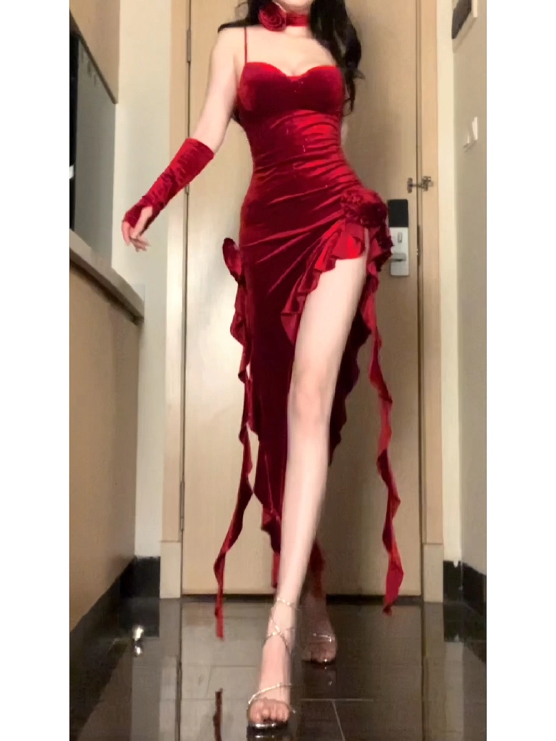 Sexy Spaghetti Straps Red Velvet Ruffle Slit Party Dress Birthday Dress YM2210