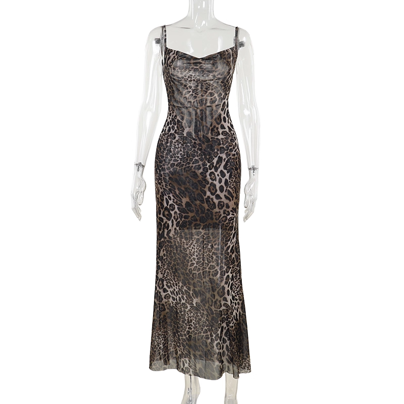 Sexy Suspender Vacation Dress New Style Strappy Large Backless Leopard Print Sheath Long Holiday Dress YM2229