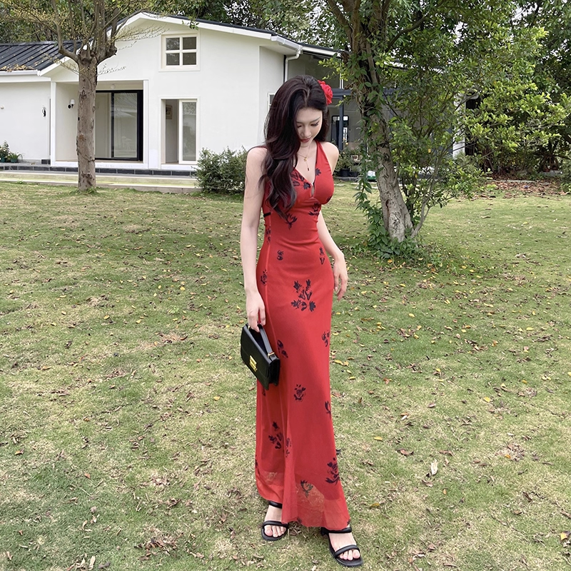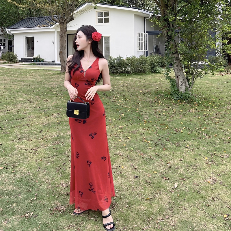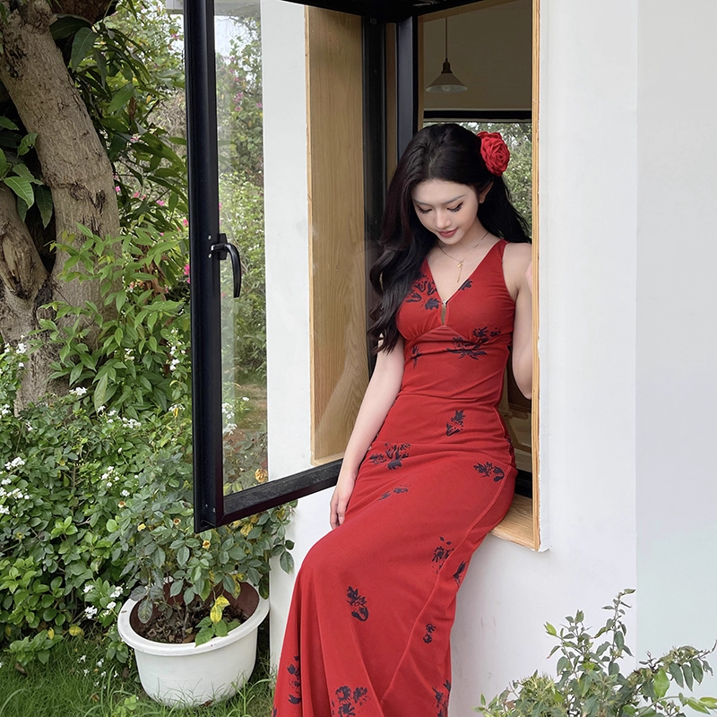 Sexy V Neck Red Print Floral Long Birthday Dress Vacation Dress YM2203