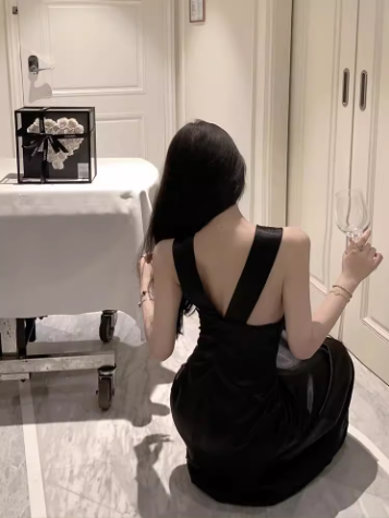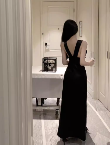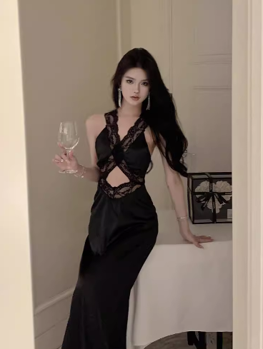 Sexy Waist-baring Lace Suspender Holiday Dress Black halter Long Birthday Dress YM2337