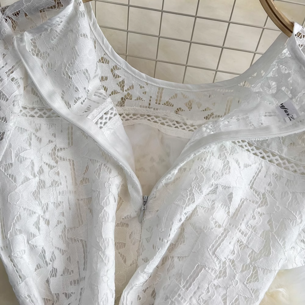 Short-sleeved round neck lace stitching waist A-line pleated dress, YM266