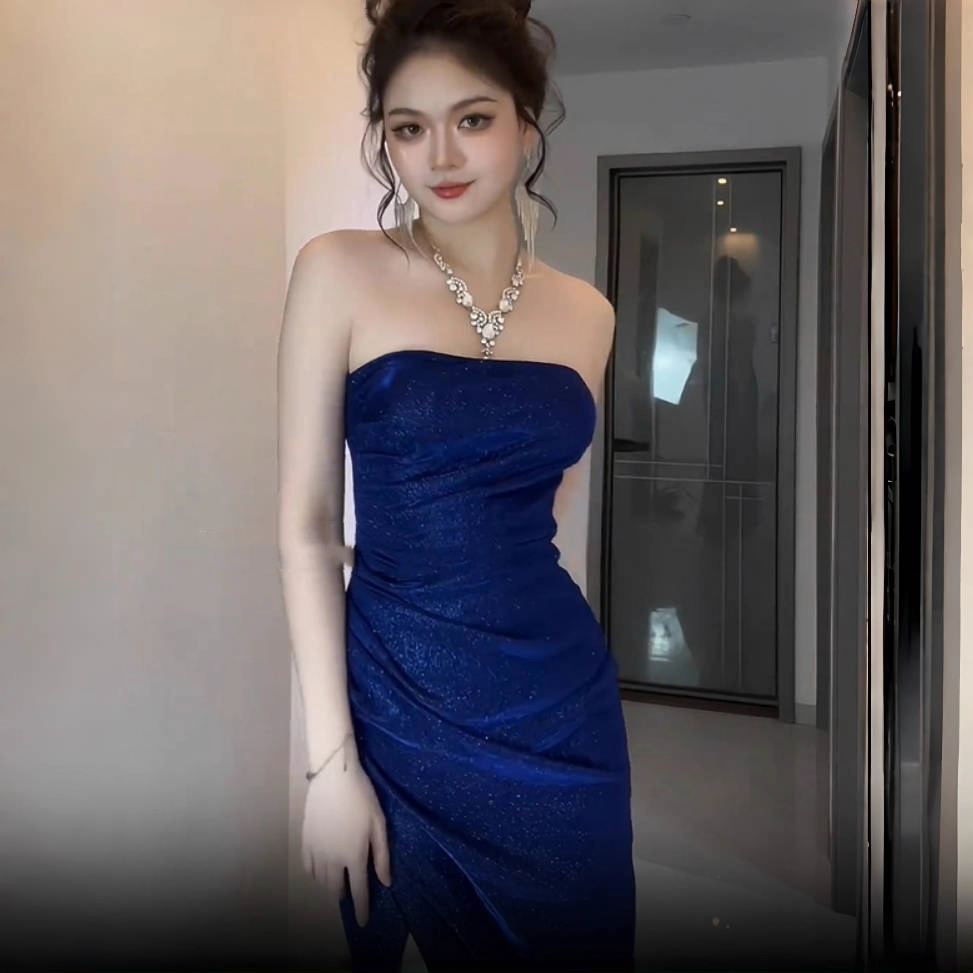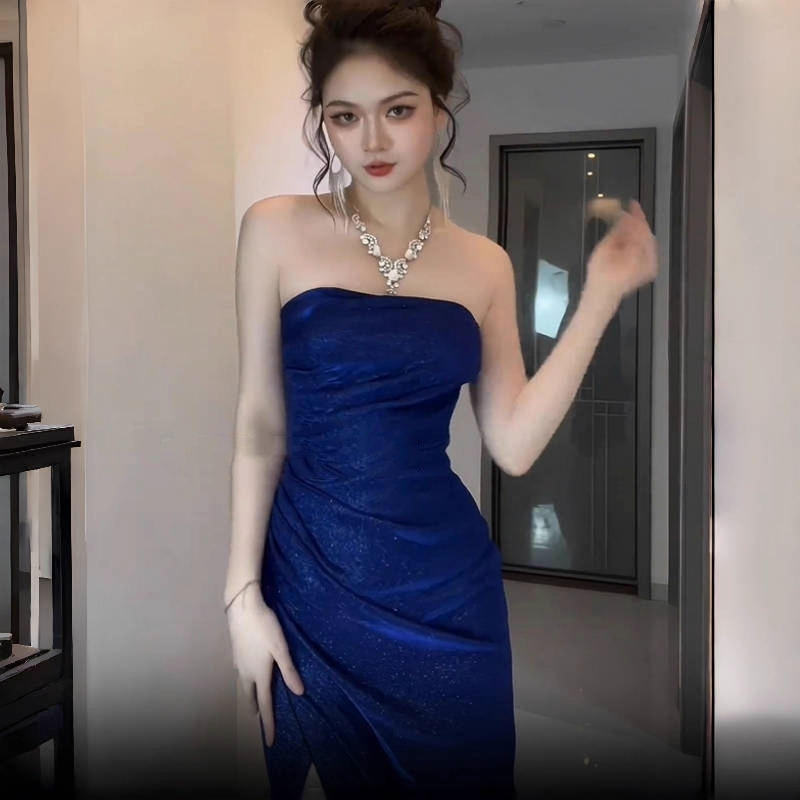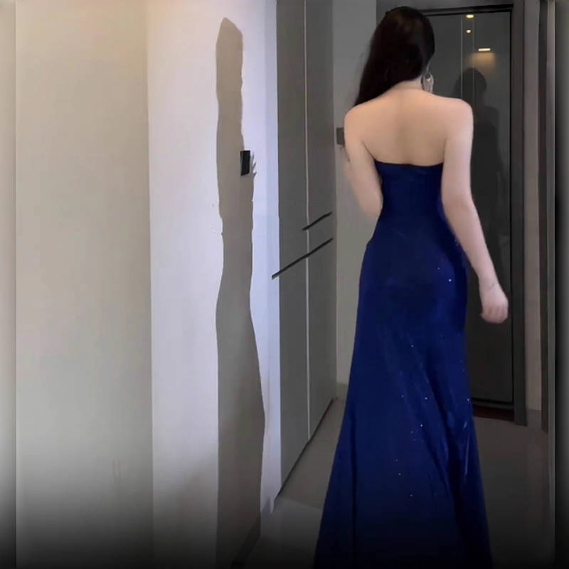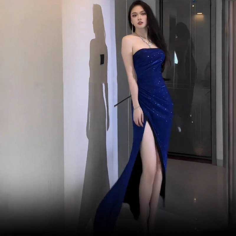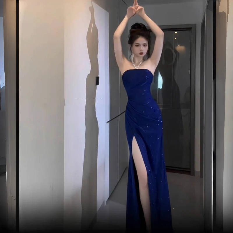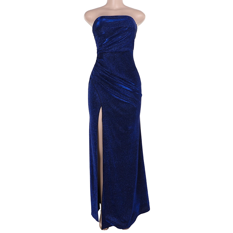 Sparkly Blue Strapless High Slit Long Party Dress Birthday Dress YM2207
