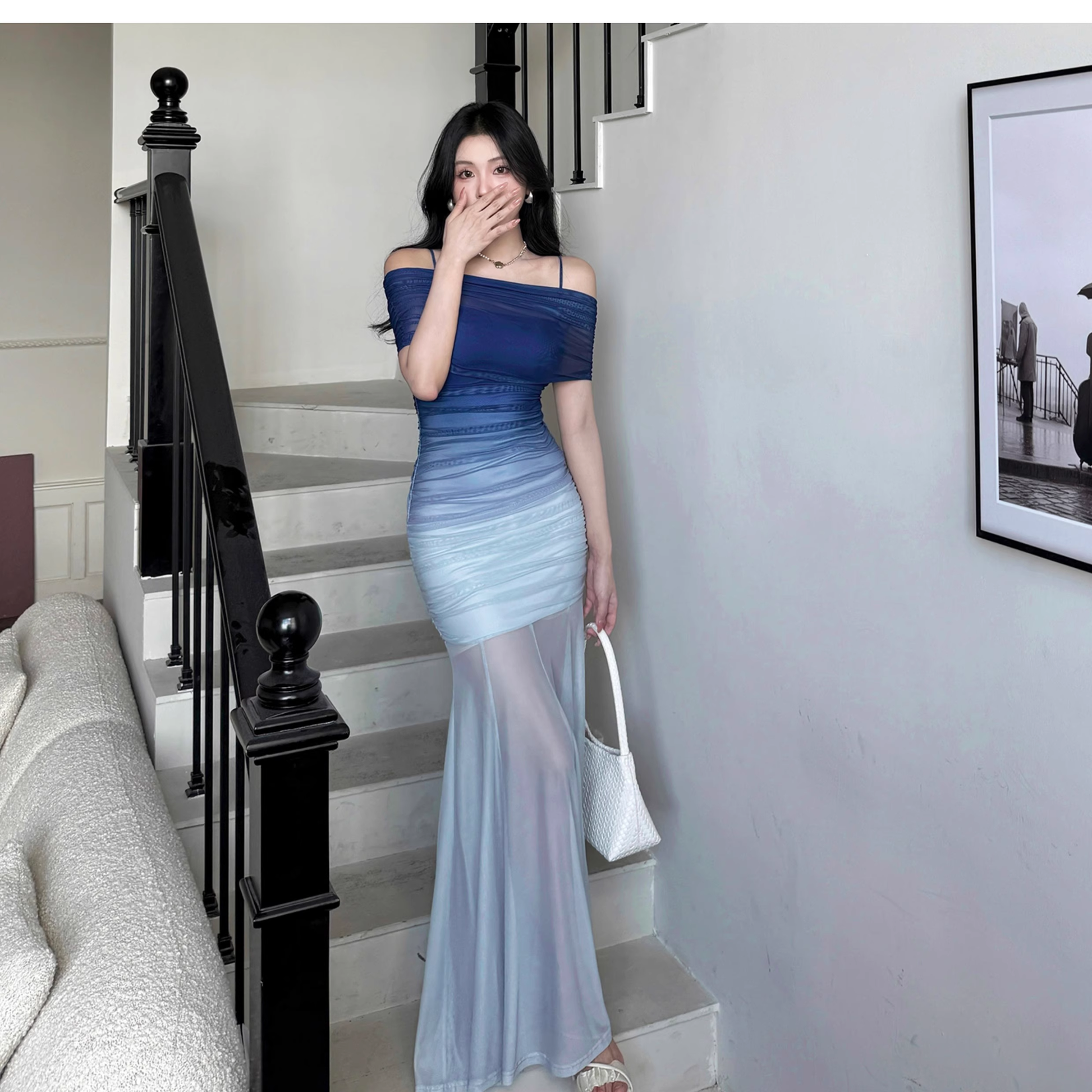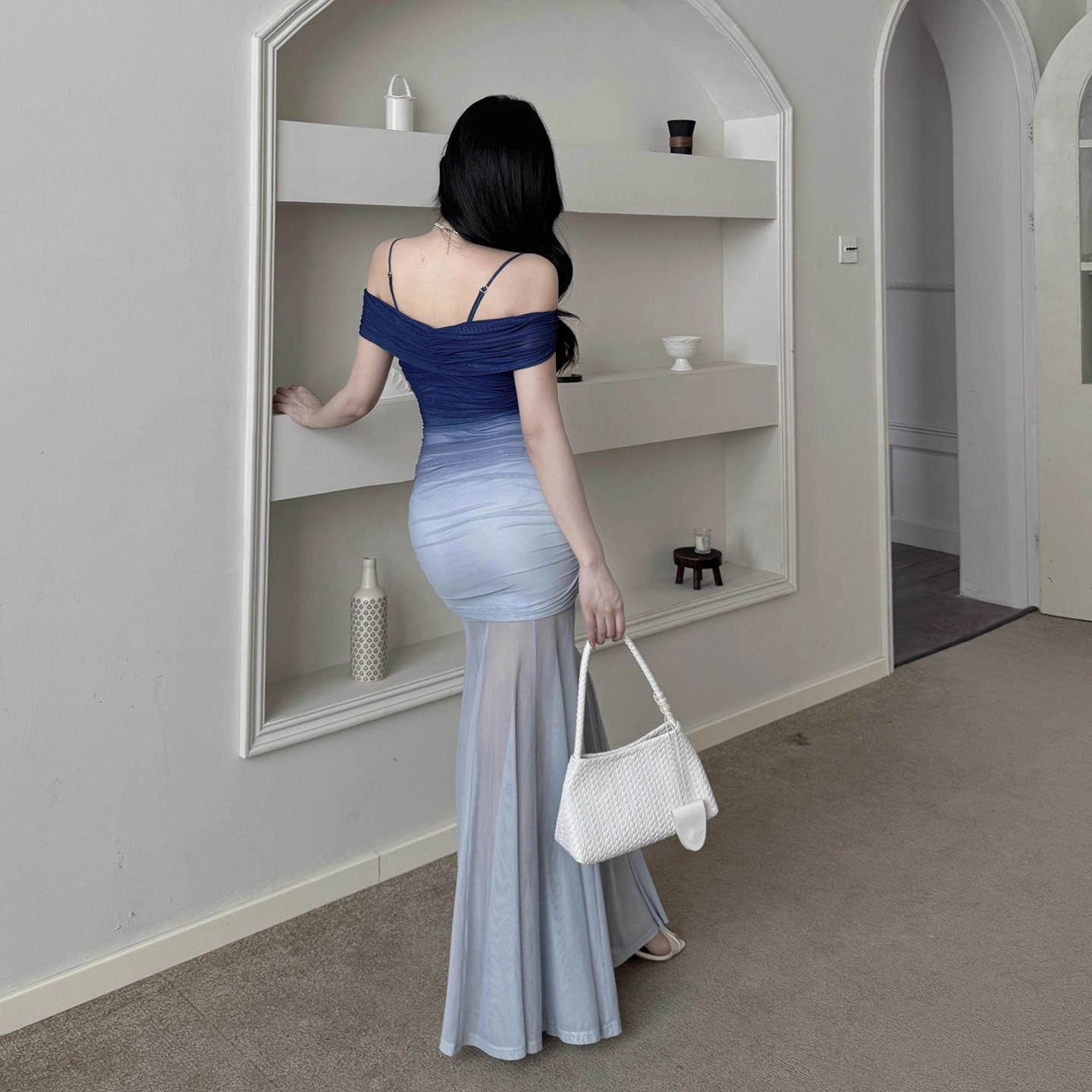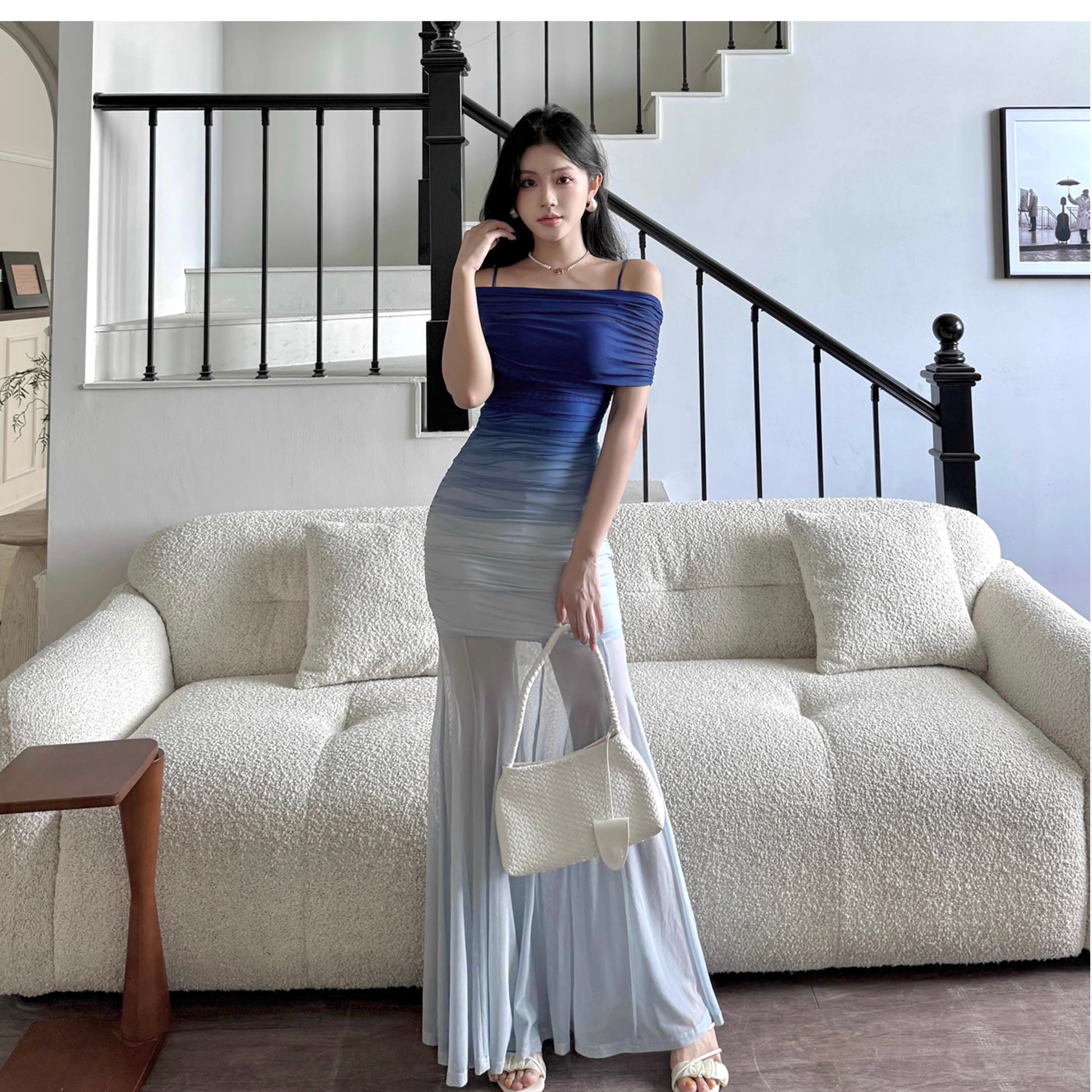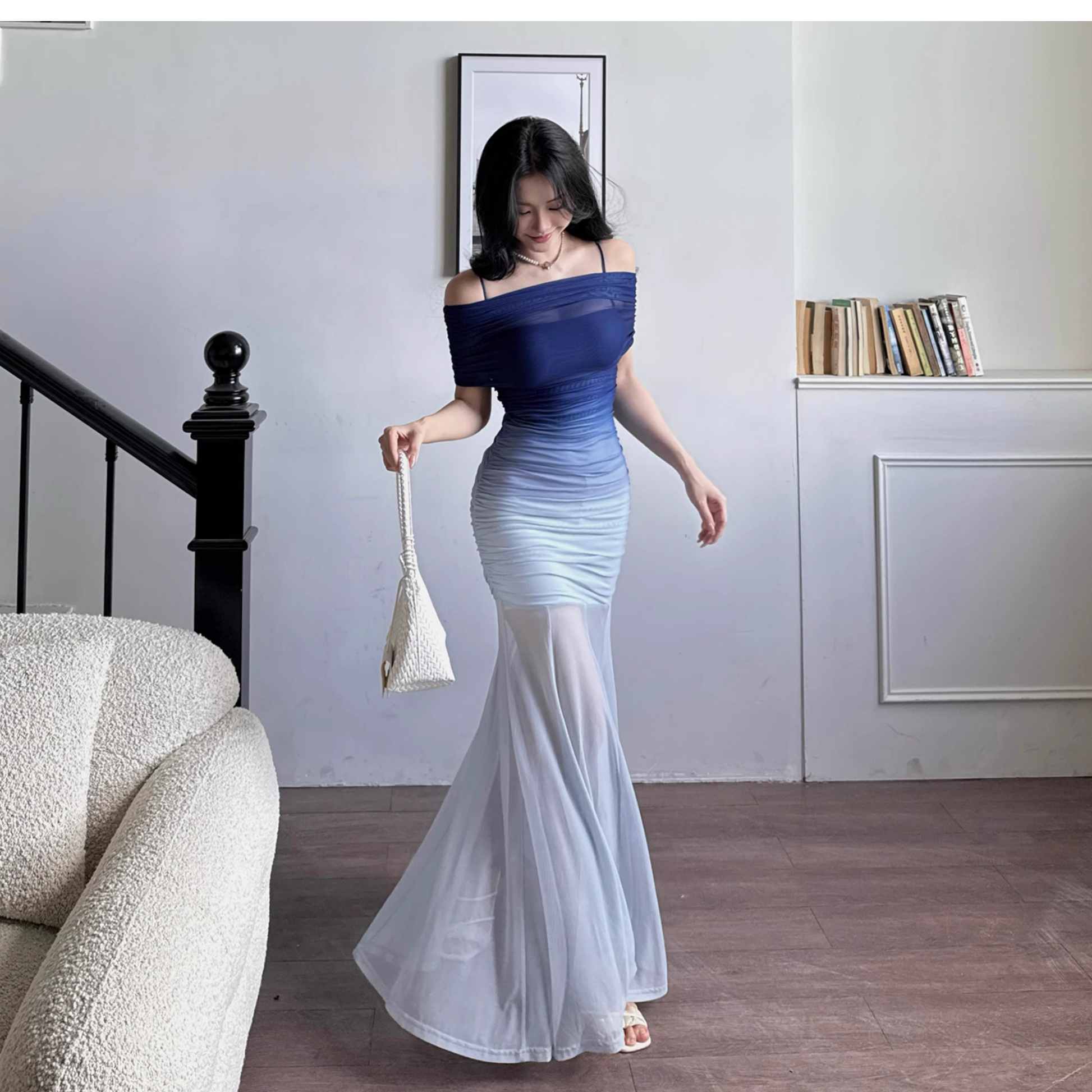 Unique Off The Shoulder Blue Ombre Sheath Long Vacation Dress Holiday Dress YM2276